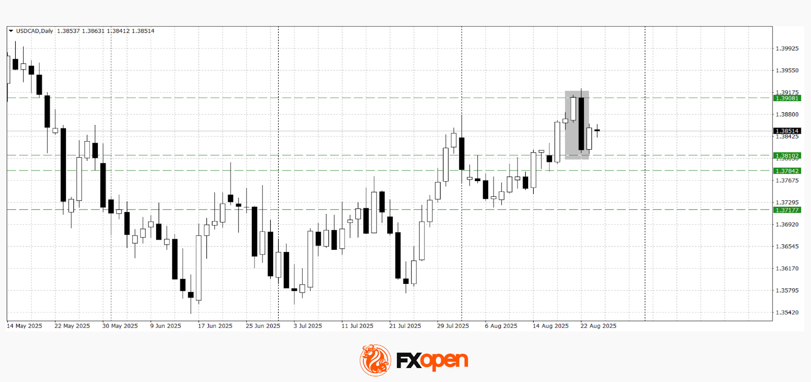 The test of key resistance at 1.3920 in USD/CAD ended with a sharp pullback and the formation of a bearish engulfing pattern on the daily timeframe. Technical analysis of USD/CAD points to a possible test of the important support levels at 1.3780–1.3810. A downward scenario could be invalidated if the price consolidates above 1.3900.