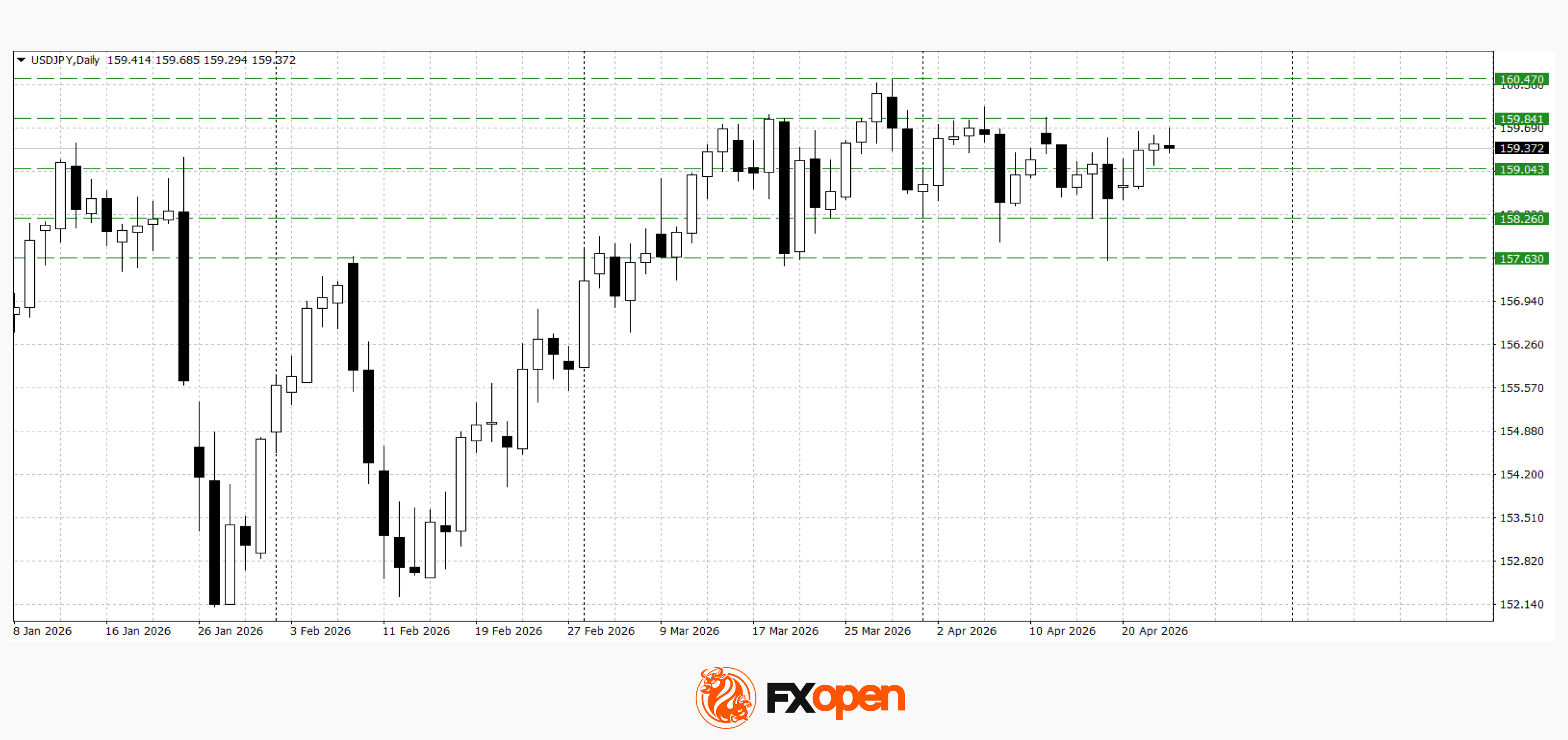 USD/JPY is moving higher, approaching key weekly resistance levels in the 159.70–160.00 range. The pair’s movement reflects a combination of dollar strength and reduced demand for the yen as a safe-haven asset. If current conditions persist, a further advance and a test of March highs cannot be ruled out. At the same time, rejection from this resistance zone may slow momentum and trigger a short-term pullback.