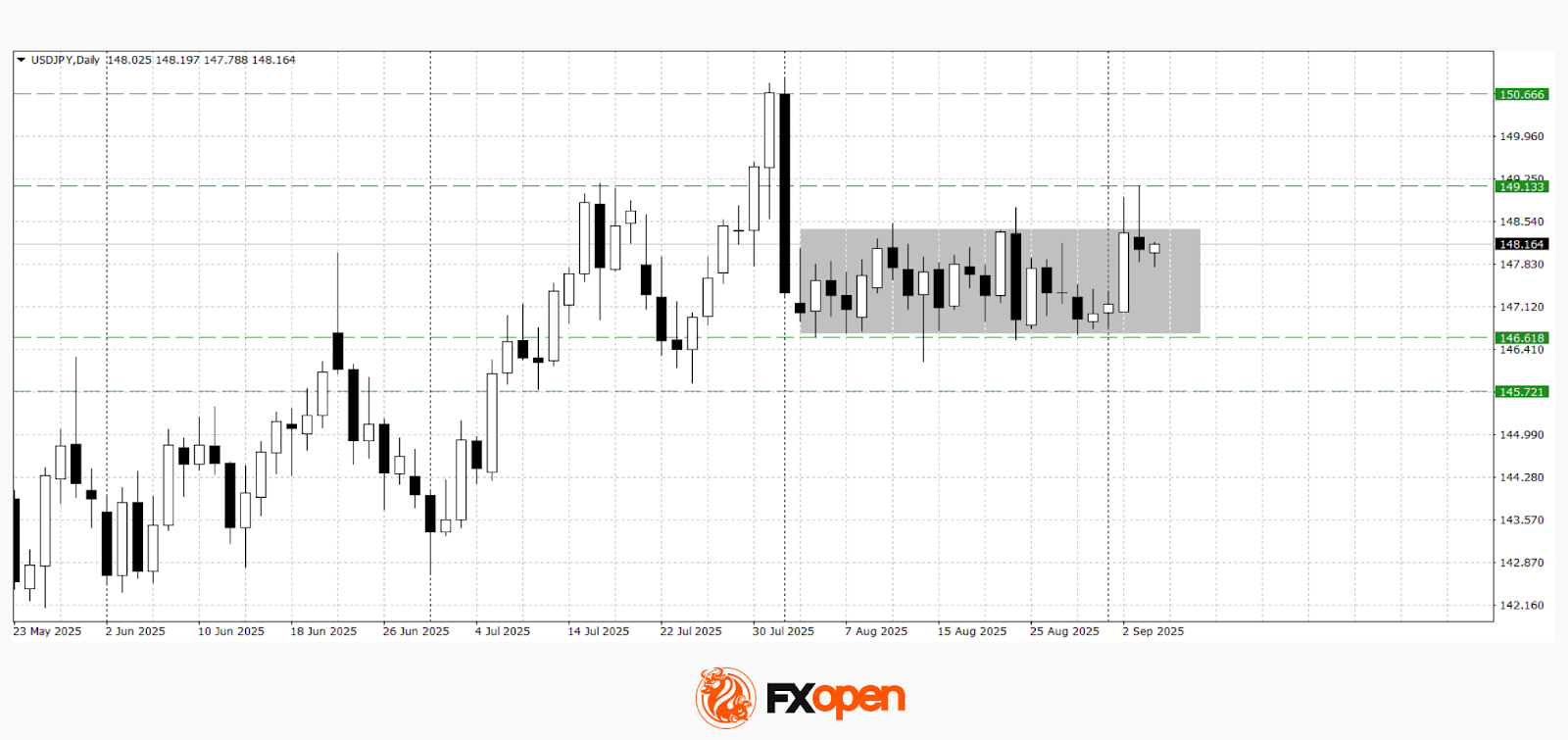 Yesterday, USD/JPY buyers made another attempt to break out of the medium-term sideways range of 146.40–148.60. The test of 149.00 ended in a sharp pullback, sending the price back into the previously established corridor. It seems investors are holding off on fresh positions while awaiting new data.