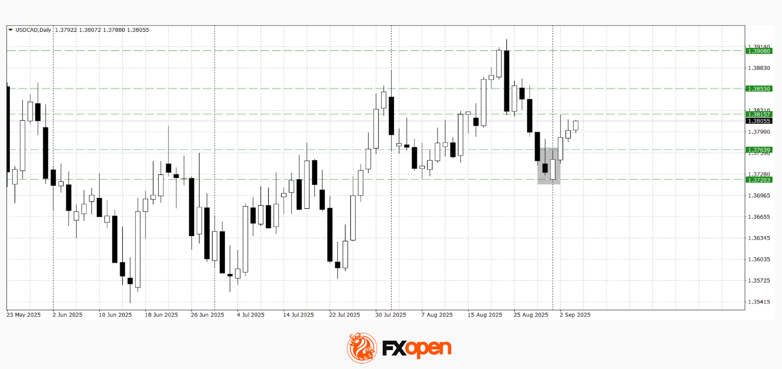 Following the formation of a bullish engulfing pattern on the daily timeframe, the USD/CAD pair managed to test key resistance at 1.3800. Technical analysis of USD/CAD points to potential strengthening towards 1.3860–1.3900 if the 1.3800 level turns into support. A pullback from current levels could trigger a decline towards 1.3720–1.3760.
