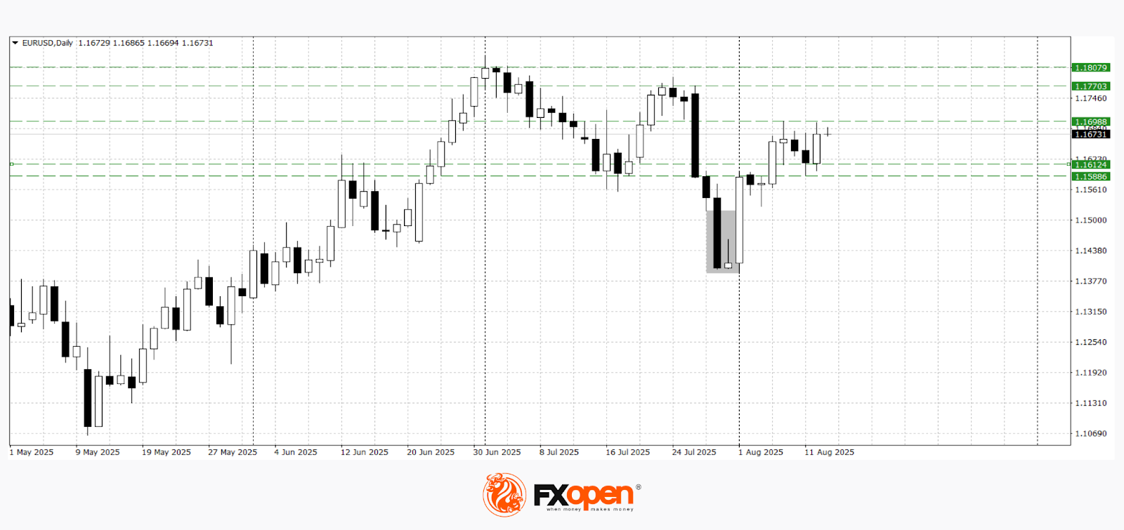 The EUR/USD and GBP/USD pairs continue to move higher, responding to weaker-than-expected US inflation figures and sustained demand for European currencies. Yesterday, the US dollar depreciated against the euro and the pound after the Bureau of Labor Statistics reported a slowdown in consumer price growth in July. The Consumer Price Index (CPI) rose by 2.7%, whereas the consensus forecast anticipated an acceleration to 2.8%. The decline in inflation was largely driven by a 9.5% year-on-year drop in petrol prices. However, core inflation, which excludes food and energy, increased to 3.1% (forecast = 3.0%), reflecting rising costs in services such as airfares, healthcare, and leisure.