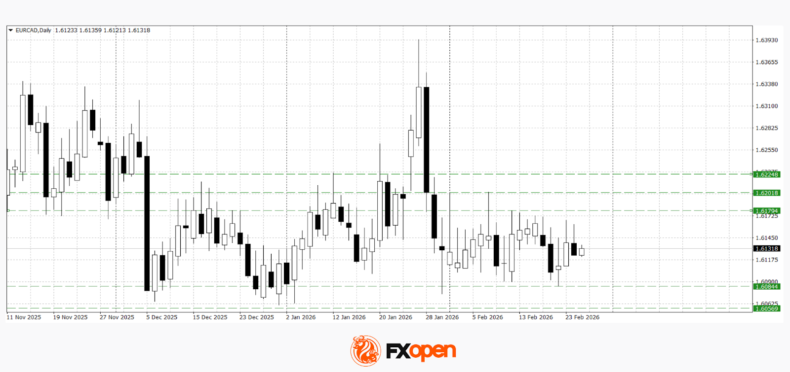 The euro has moved into a phase of correction and consolidation ahead of key macroeconomic releases. In EUR/USD, a technical pullback is unfolding following the previous decline, while EUR/CAD continues a more extended corrective move within its medium-term structure. Market activity is easing as traders await important data from the euro area, the United States and Canada, which could determine the next directional move.