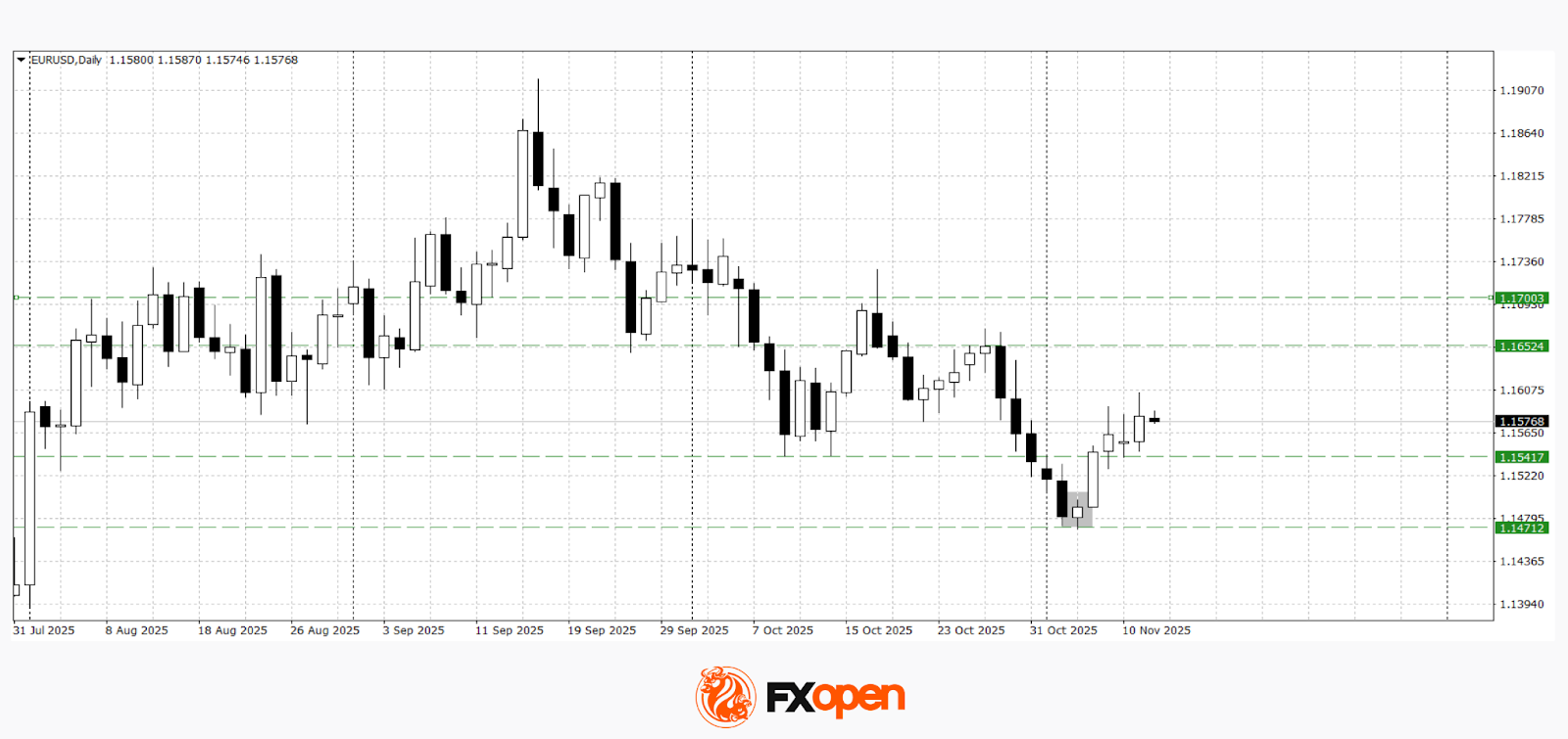 At the end of last week, EUR/USD buyers managed to defend the key 1.1500 support level and form a bullish “piercing line” pattern on the daily chart. Technical analysis suggests that this formation may continue to play out, with the potential for a rise towards 1.1650–1.1700. A break below the 1.1540 support could lead the pair to revisit the current month’s lows.