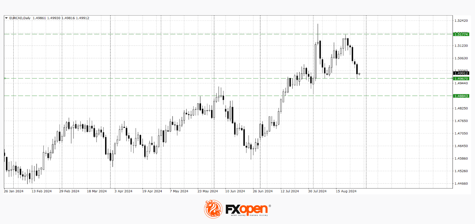 Technical analysis of the EUR/CAD pair also indicates range-bound trading, but within a wider corridor. Two weeks ago, the price surged and tested key resistance at 1.5200. It failed to consolidate above on the first attempt, and the pair dropped to 1.4970. Last week, buyers made another attempt to break through 1.5200, but again without success. Currently, the price is trading at the lower boundary of the four-week range between 1.5220-1.4970.