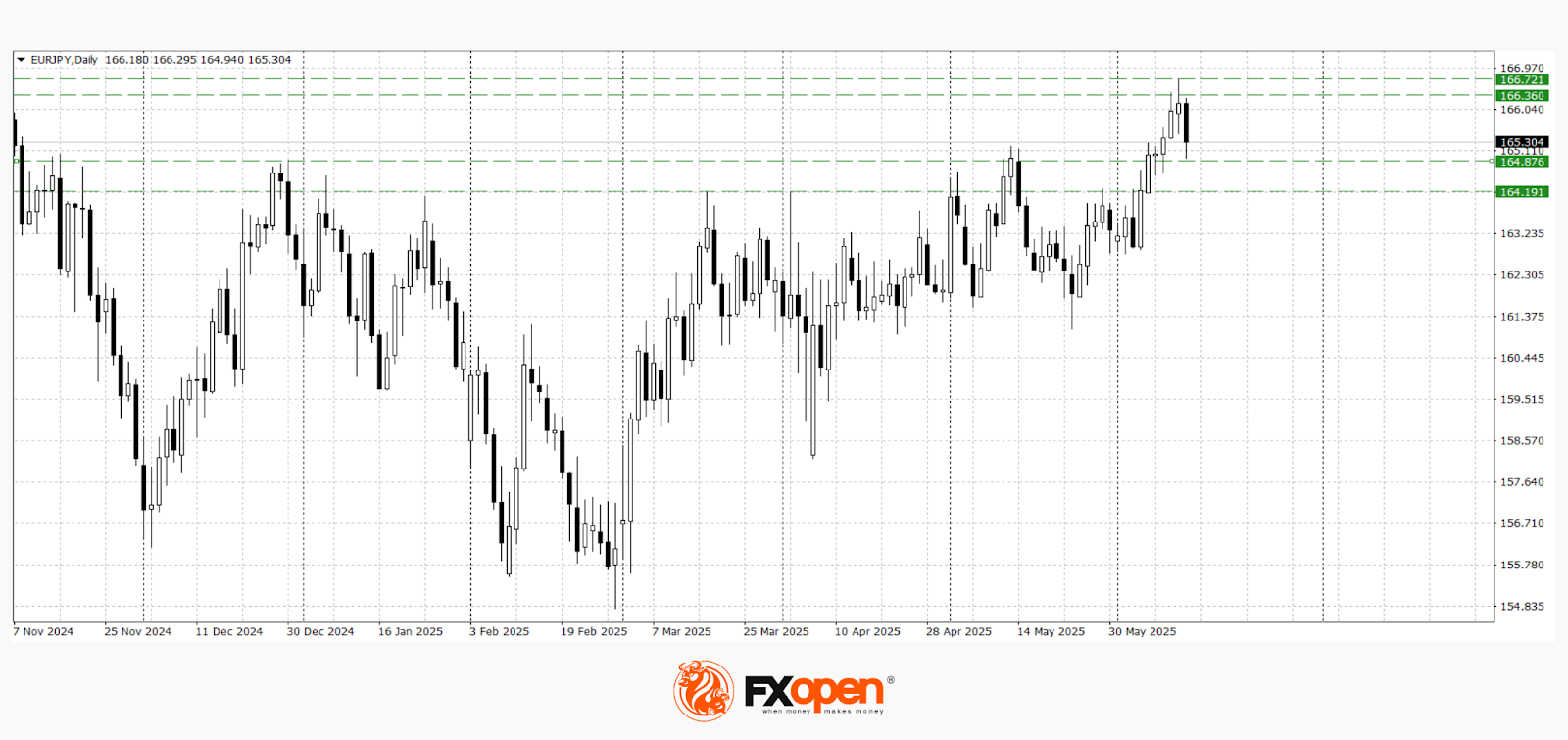 Technical analysis of EUR/JPY suggests a potential corrective pullback following the recent strong rally. The next area where the pair may resume its upward movement lies around 165.00–164.70.
