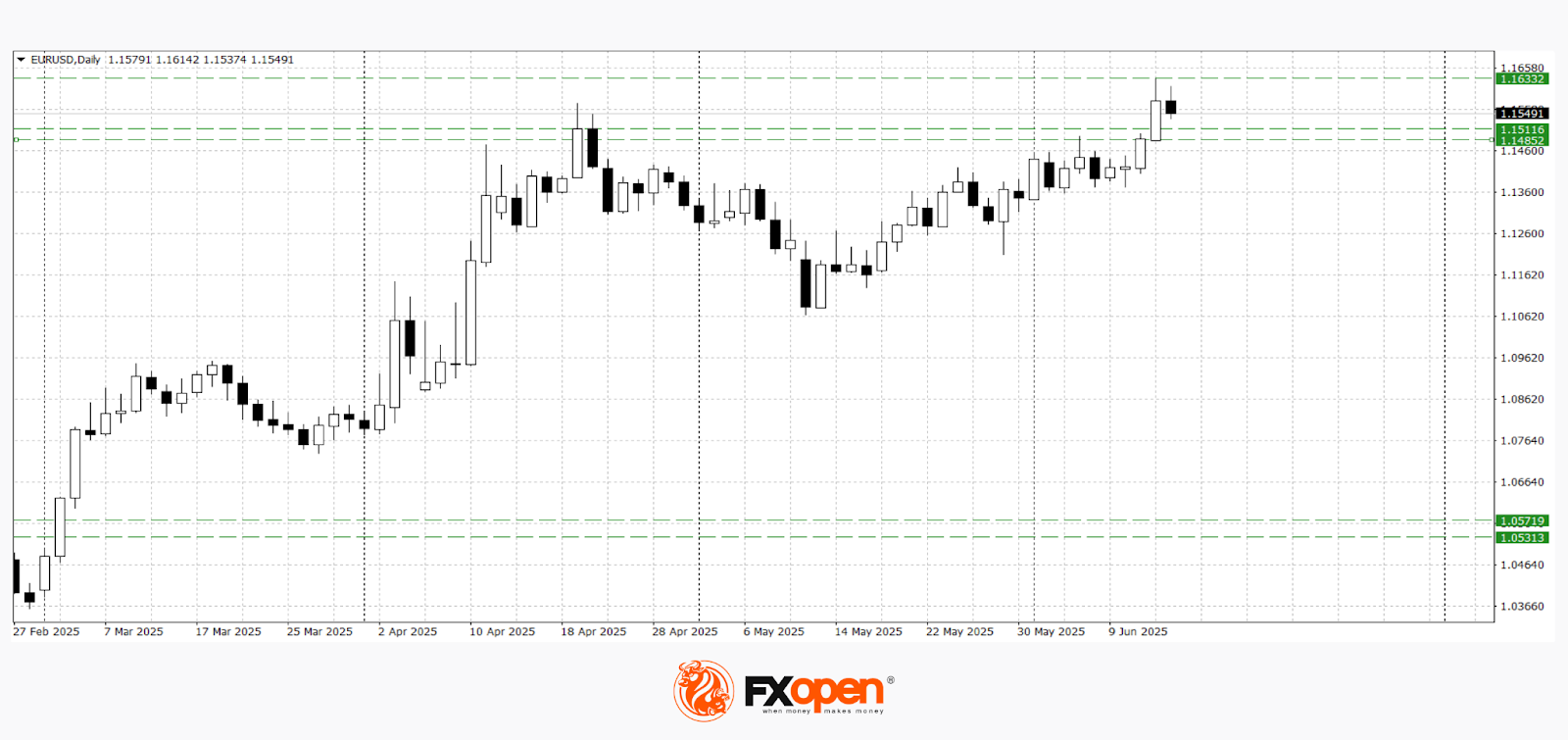 European currencies, particularly EUR/USD and EUR/JPY, are showing strong gains amid a notable weakening of the US dollar. Pressure on the greenback intensified following the release of a series of disappointing macroeconomic indicators. In May, the core Consumer Price Index (CPI) rose by just 0.1% — well below expectations — while the headline CPI came in at 2.4% versus a forecast of 2.5%.