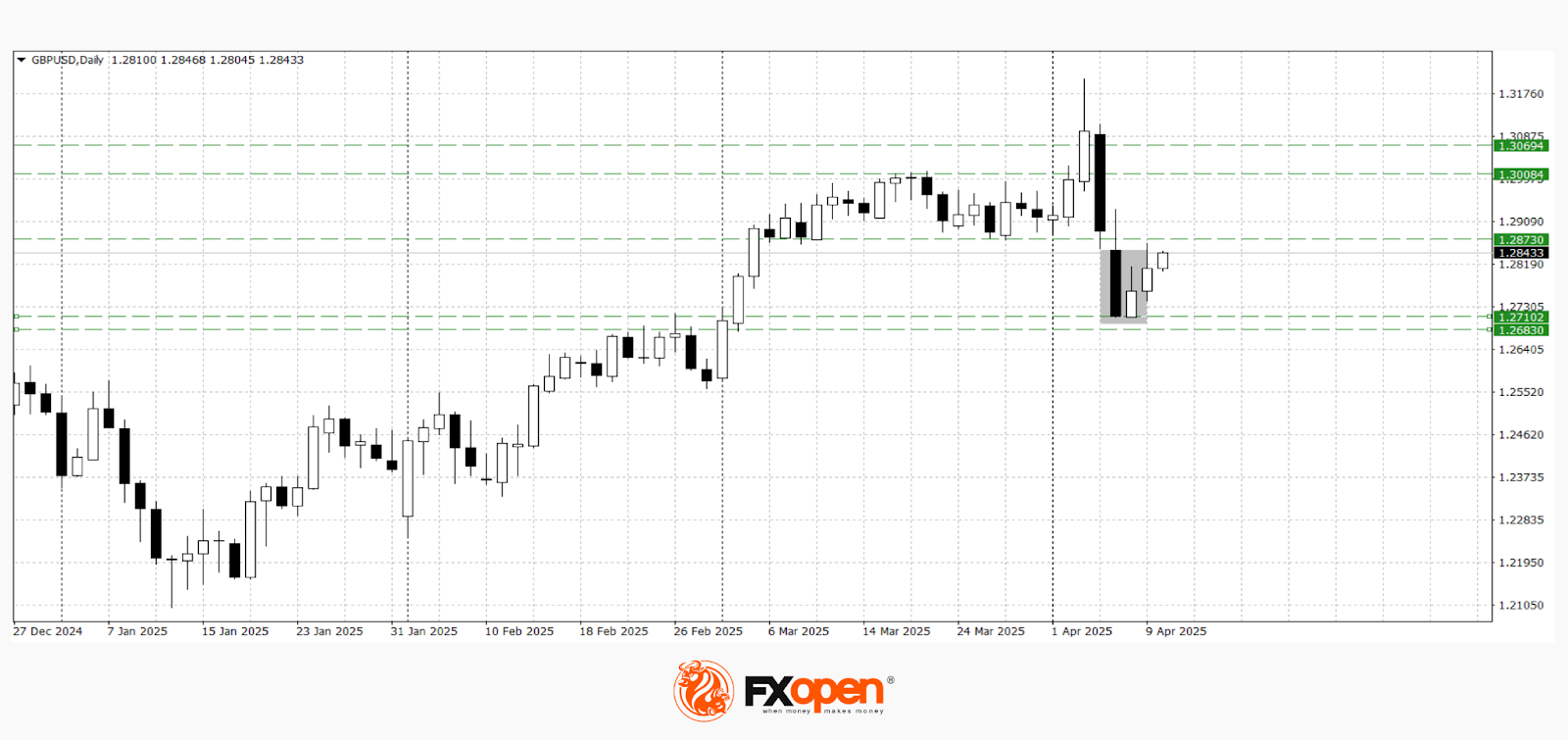 The losses in GBP/USD after testing 1.3200 amounted to more than 400 pips. The announcement of a 90-day pause on the action of the imposed tariffs allowed buyers of the pair to find support at 1.2700 and form a reversal pattern, the “bullish harami”, on the daily timeframe. Technical analysis of GBP/USD suggests a potential rise towards 1.2900–1.2870.