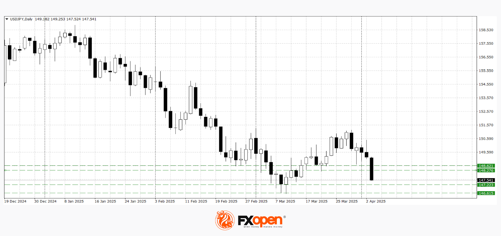 Yesterday, before Donald Trump’s speech, the USD/JPY currency pair was trading near 150.00. Better-than-expected preliminary labour market data and a rise in US industrial orders for February (0.6% versus the forecast of 0.5%) contributed to a slight strengthening of USD/JPY. However, the US President’s announcement of trade tariffs led to sharp market fluctuations and a loss of more than 150 pips for USD/JPY within just a few hours. At present, the pair is trading below 148.00. A technical analysis of USD/JPY suggests a possible test of this year’s March lows in the 147.20–146.70 range.