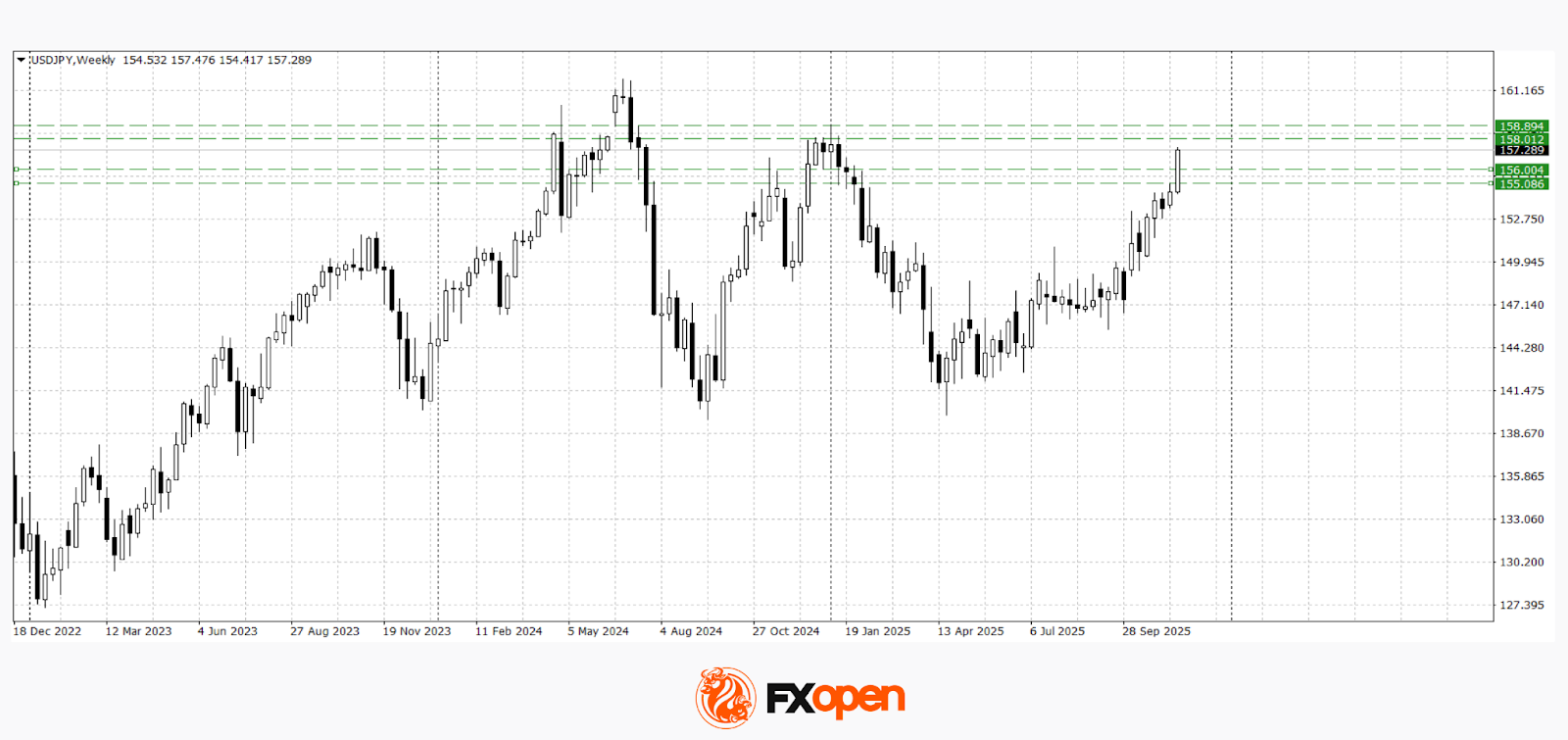 The USD/JPY pair has reached this year’s extremes, reacting to the monetary-policy differential. The pair is trading above 157.00, reflecting a combination of a more resilient dollar and the Bank of Japan’s persistently dovish stance. The market still does not see the Japanese regulator preparing for tightening, whereas the Fed, despite being in a rate-cutting cycle, maintains a cautious tone and highlights inflation risks.