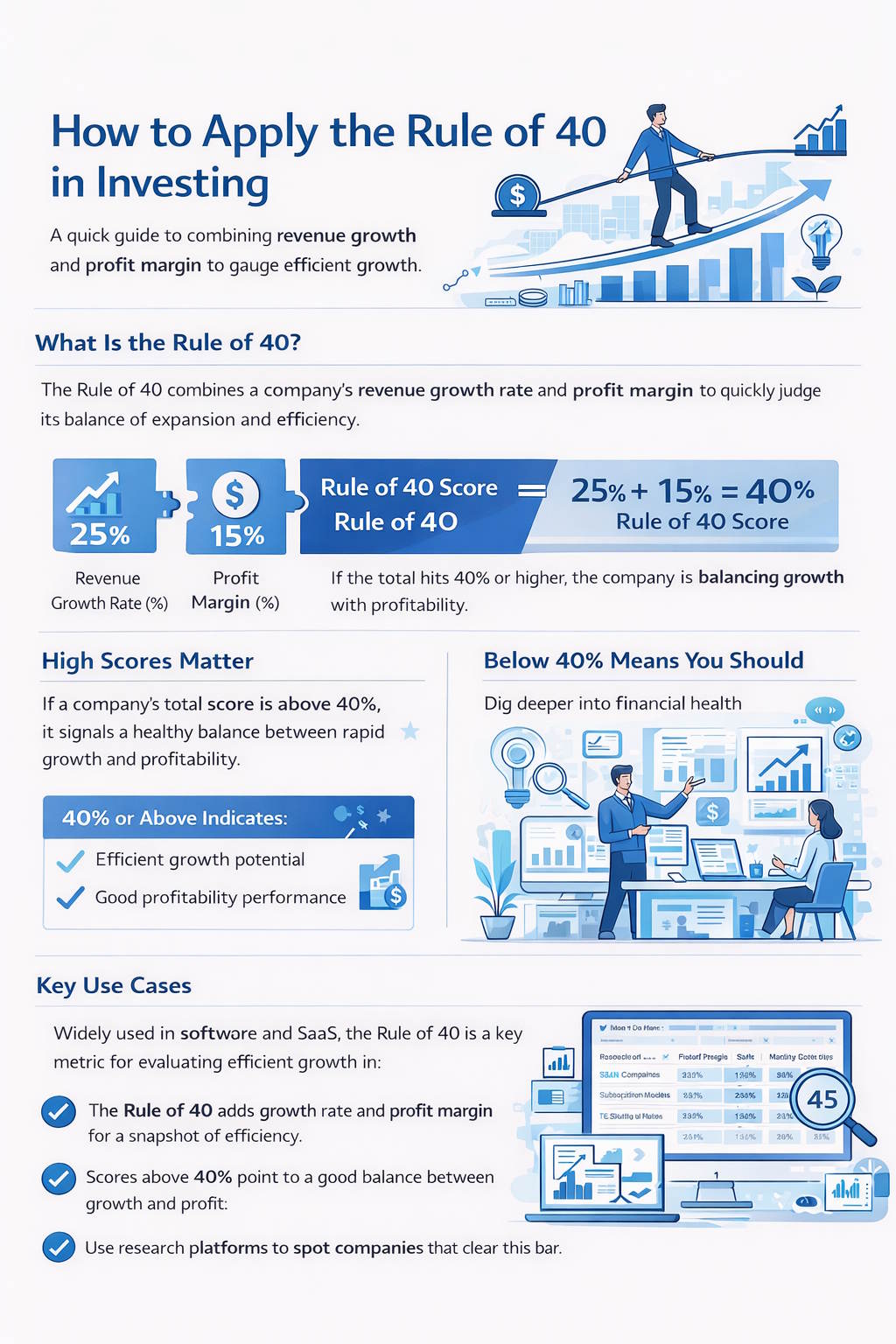 The Rule of 40 helps you figure out if a company—especially a SaaS or software firm—balances growth and profitability well. It’s a quick gut check before you dive into the weeds, used by both investors and operators.