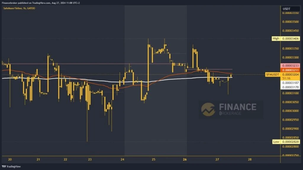 Last Thursday, the price of SafeMoon fell to a new low of 0.00002828. After that, we looked at the bullish consolidation until Saturday and the formation of a new high at 0.00003406. We didn’t have the strength to continue, and a pullback towards the EMA 200 moving average was initiated. Last night, we saw the first breakout below, and this morning a new weekly low was formed at the 0.00003100 level. The price quickly managed to stylize and move back above the 200 EMA.