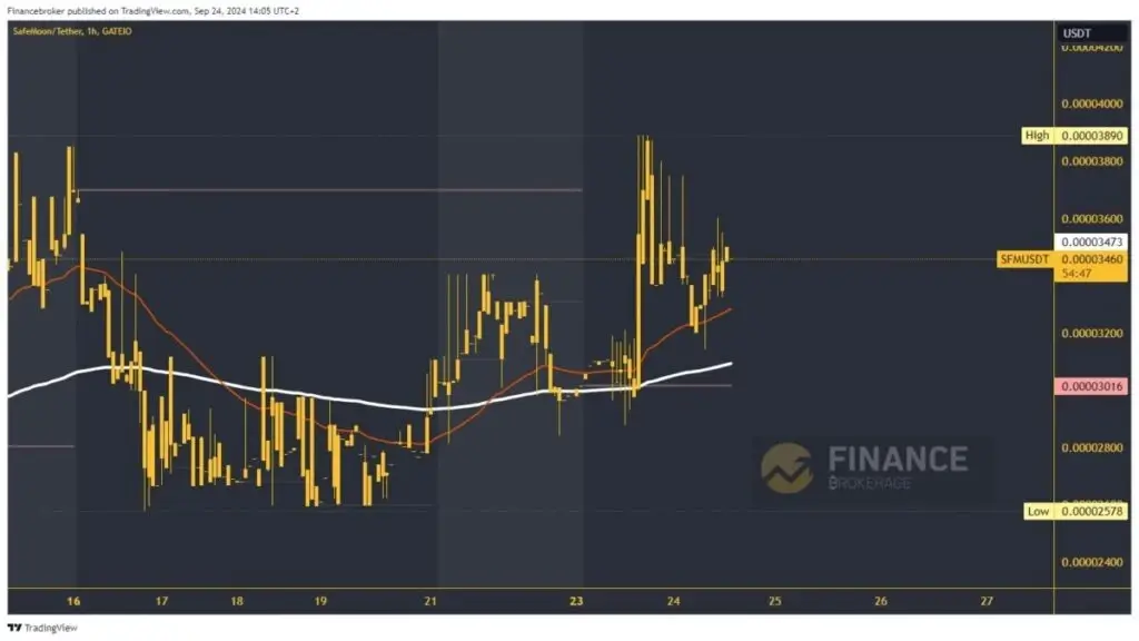 Over the weekend, the SafeMoon price managed to bounce back above the EMA 200 moving average. After the weekend, lateral consolidation in the 0.00003000-0.00003400 range. On Monday, we saw a breakout above and the formation of a new weekly high at the 0.00003890 level. Soon after, SafeMoon began to lose strength, causing a pullback to support at 0.00003200.