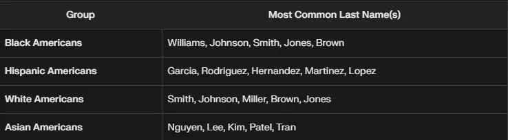 Most importantly, we chose last names that are prominent in specific demographics. According to a report by data analysis site Viborc, the most common last names in the United States in 2023 included Williams, Garcia, Smith, and Nguyen.