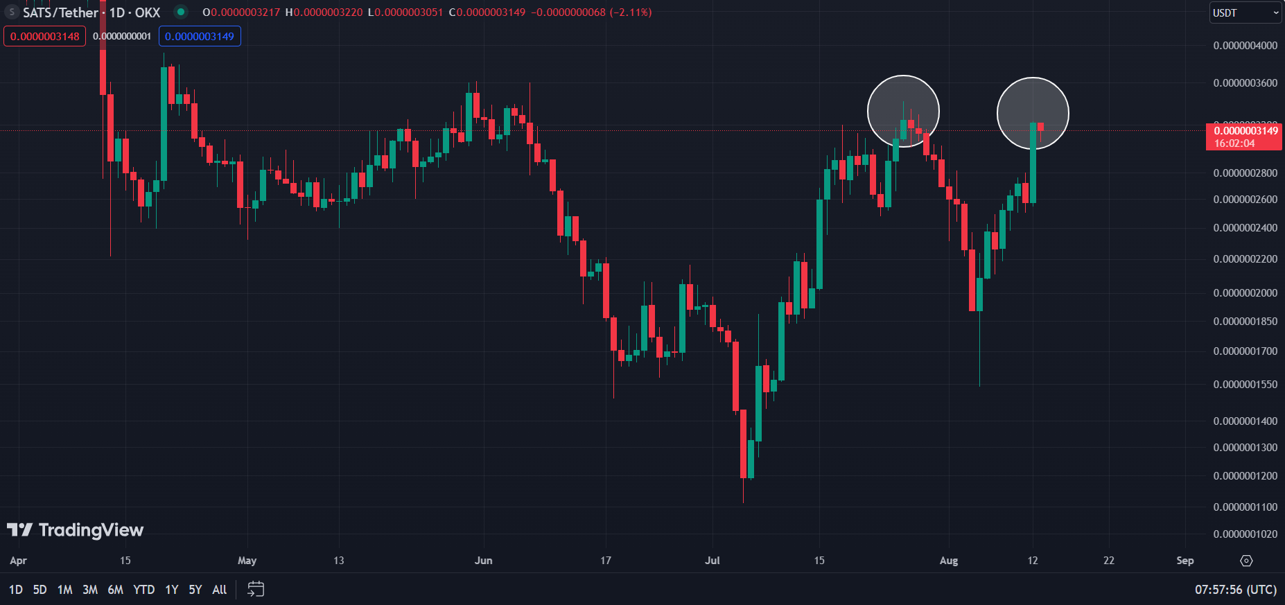 Despite a 2% drop this morning, SATS has defended the support around the $0.0000031 psychological mark. The asset is trading at $0.000003148 at the time of writing, representing an impressive 104% gain from the Aug. 5 floor price.