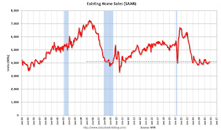 10:00 AM: Existing Home Sales for December from the National Association of Realtors (NAR). The consensus is for 4.23 million SAAR, up from 4.13 million.The graph shows existing home sales from 1994 through the report last month.