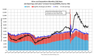 This graph shows job openings (black line), hires (dark blue), Layoff, Discharges and other (red column), and Quits (light blue column) from the JOLTS.