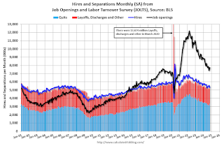 This graph shows job openings (black line), hires (dark blue), Layoff, Discharges and other (red column), and Quits (light blue column) from the JOLTS.