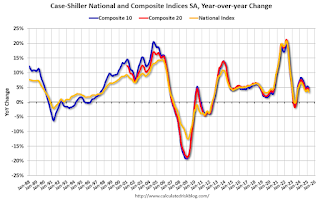 This graph shows the year-over-year change in the seasonally adjusted National Index, Composite 10 and Composite 20 indexes through the most recent report (the Composite 20 was started in January 2000).
