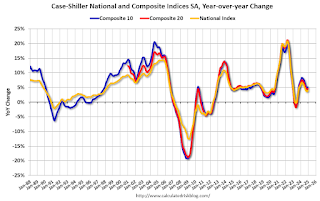 This graph shows the year-over-year change for the Case-Shiller National, Composite 10 and Composite 20 indexes, through the most recent report (the Composite 20 was started in January 2000).