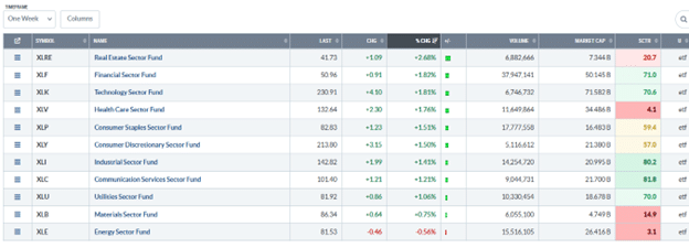 Above, we see that Real Estate is the best performer for the week, with a price per share increase of 2.68%.