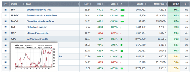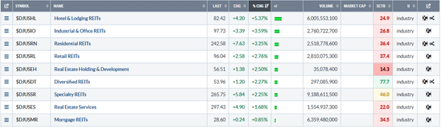 In this case, “Diversified REITs” stands out because it is the only one with a green SCTR score.