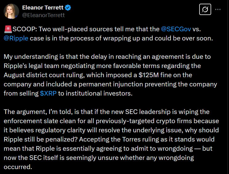 According to FOX Businesses’s Eleanor Terrett, the SEC’s case against Ripple was due to end some time ago around the beginning of 2025/late 2024, but Ripple’s legal team bargained for a better deal.