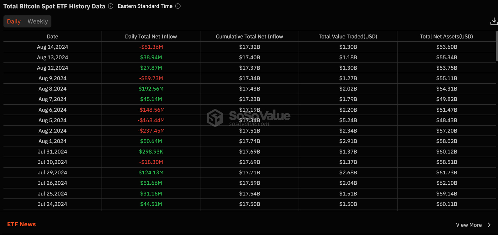 Grayscale’s GBTC led the outflows, with around US$56.8 million (AU$85.7 million) in net losses, followed by Fidelity’s FBTC, Ark and 21Shares’ ARKB, and Bitwise’s BITB. Not all funds experienced outflows; BlackRock’s IBIT and Franklin Templeton’s EZBC recorded small net inflows of US$2.6 million (AU$3.9 million) and US$3.42 million (AU$5.2 million), respectively, according to data from SosoValue.