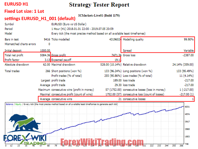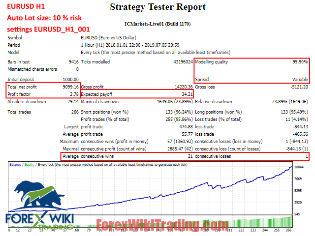 The backtesting results for the SecureWave EA using EURUSD H1 highlight its performance under different configurations: