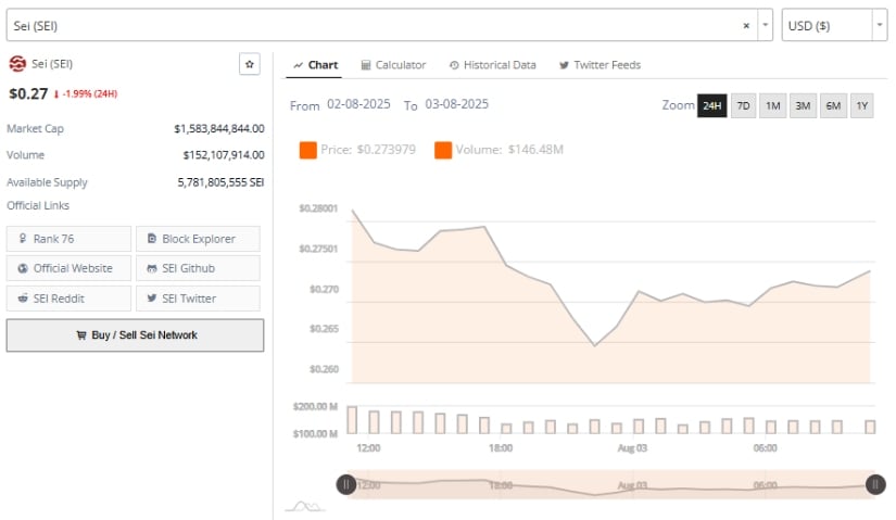 At the time of writing, SEI trades at $0.27, posting a 1.99% 24-hour decline. The market cap stands at $1.58 billion, with the token ranked 76th by overall market capitalization. The supply remains stable at approximately 5.78 billion SEI.