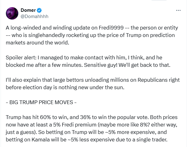 This Domer guy was, at the time, the #1 most profitable trader on Polymarket. He noticed a huge amount of money coming in on the Trump YES vote and did a little digging to discover it was this huge French whale bettor on multiple accounts, betting a staggering $40 million on Trump to win the electoral and the popular.