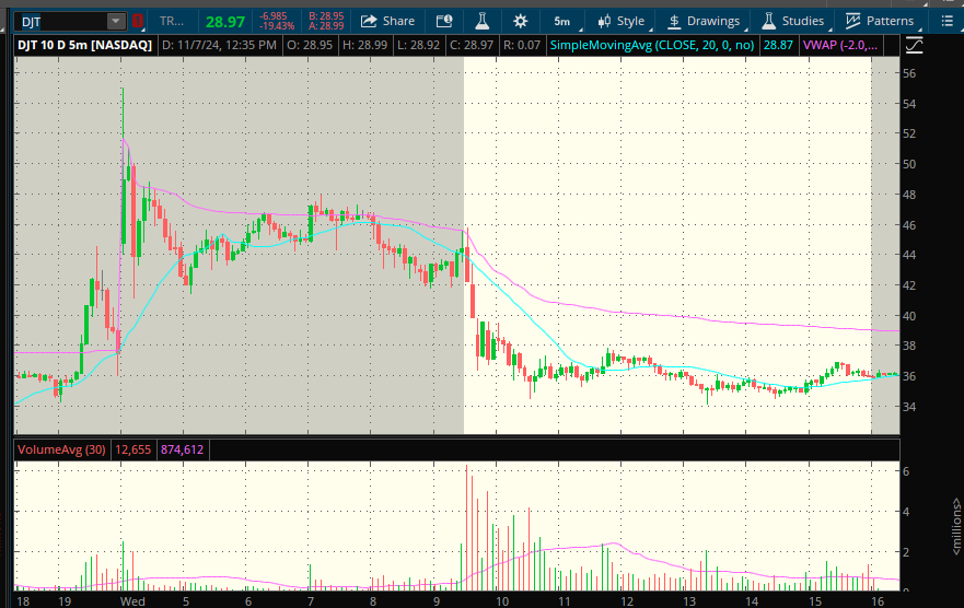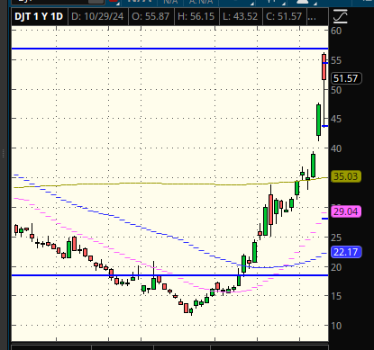 DJT CLEARLY bottoms on Monday. I mean, it dips under $30 and reclaims $30. Then it goes green after it’s been negative 4 straight days. Of course it wants a last hurrah into Nov 5th.