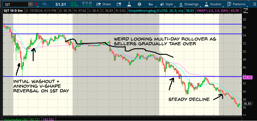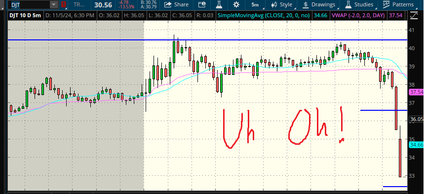 DJT has settled under $45 nicely… it *seems* like a pre-market sell-off. Fear subsides while experience and instinct return to my blood stream. I know what to do–I need to short the stock when this opens. I enter a market order at 9:30–not something I usually do but my quick thought was if this is what I think it’ll be, then the top will be in very early.