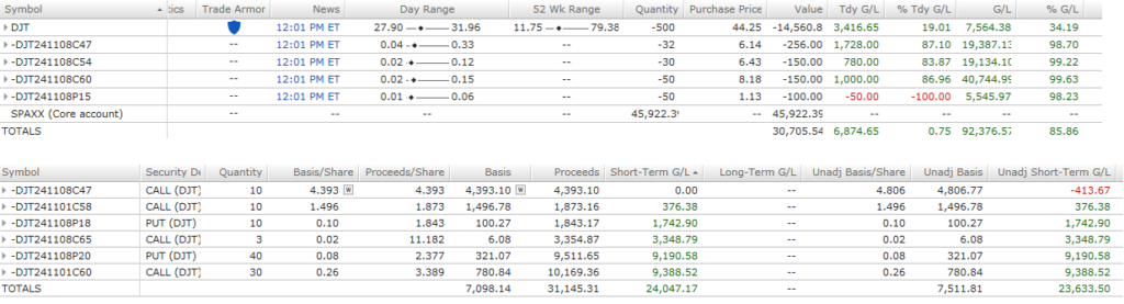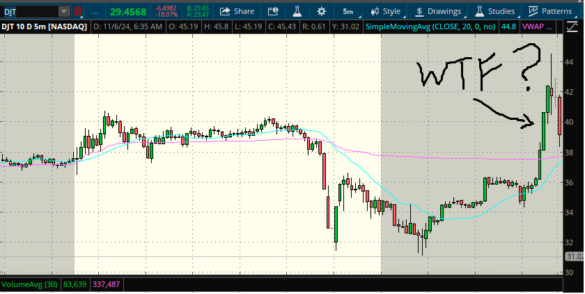 The market opens. I’m greedy and I want to make 100k so the mindset is to add risk. Adding risk at this point, with DJT having already correctly near 50% from its highs, is taking me away from doing the efficient thing, the pro thing, the sharp thing… which is to flatten my position for a fat realized profit and then have the option to reload into more volatility with 2 trading sessions to go before the moment of the truth.