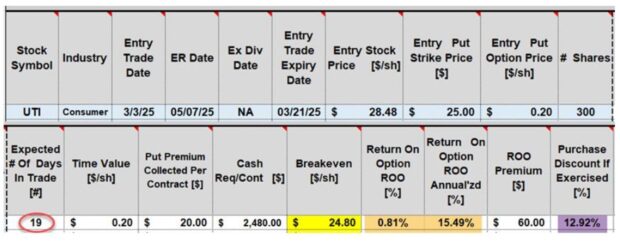• Purple cell: If shares are “put” to us at the breakeven price point of $24.80, it will represent a 12.92% discount from the price of UTI when the trade was entered