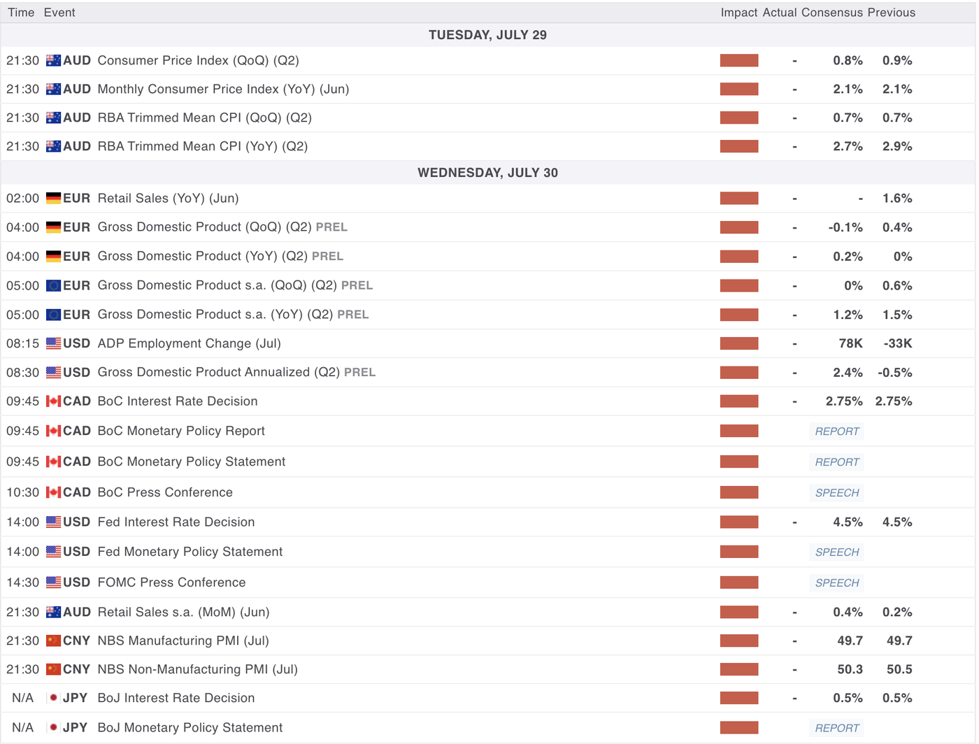 It was mentioned in the introduction but we will get Rate Decisions from the Bank of Canada (9:30 A.M), the FOMC (14:00 ET) and the Bank of Japan later in the evening.