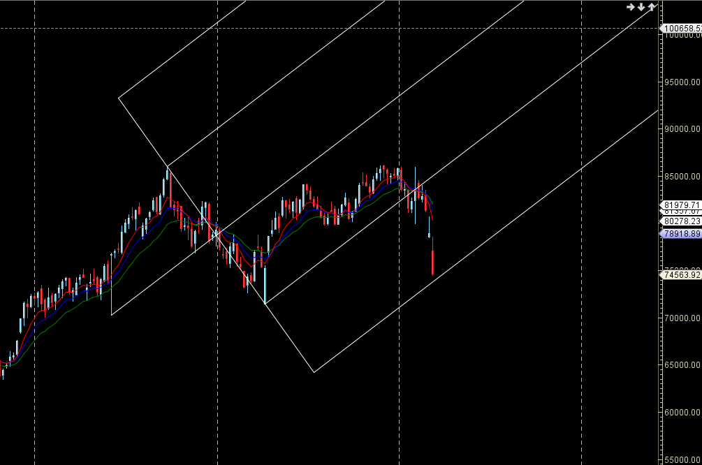 Sensex is back to its 1×5 gann angle support in range of 74100-74200.