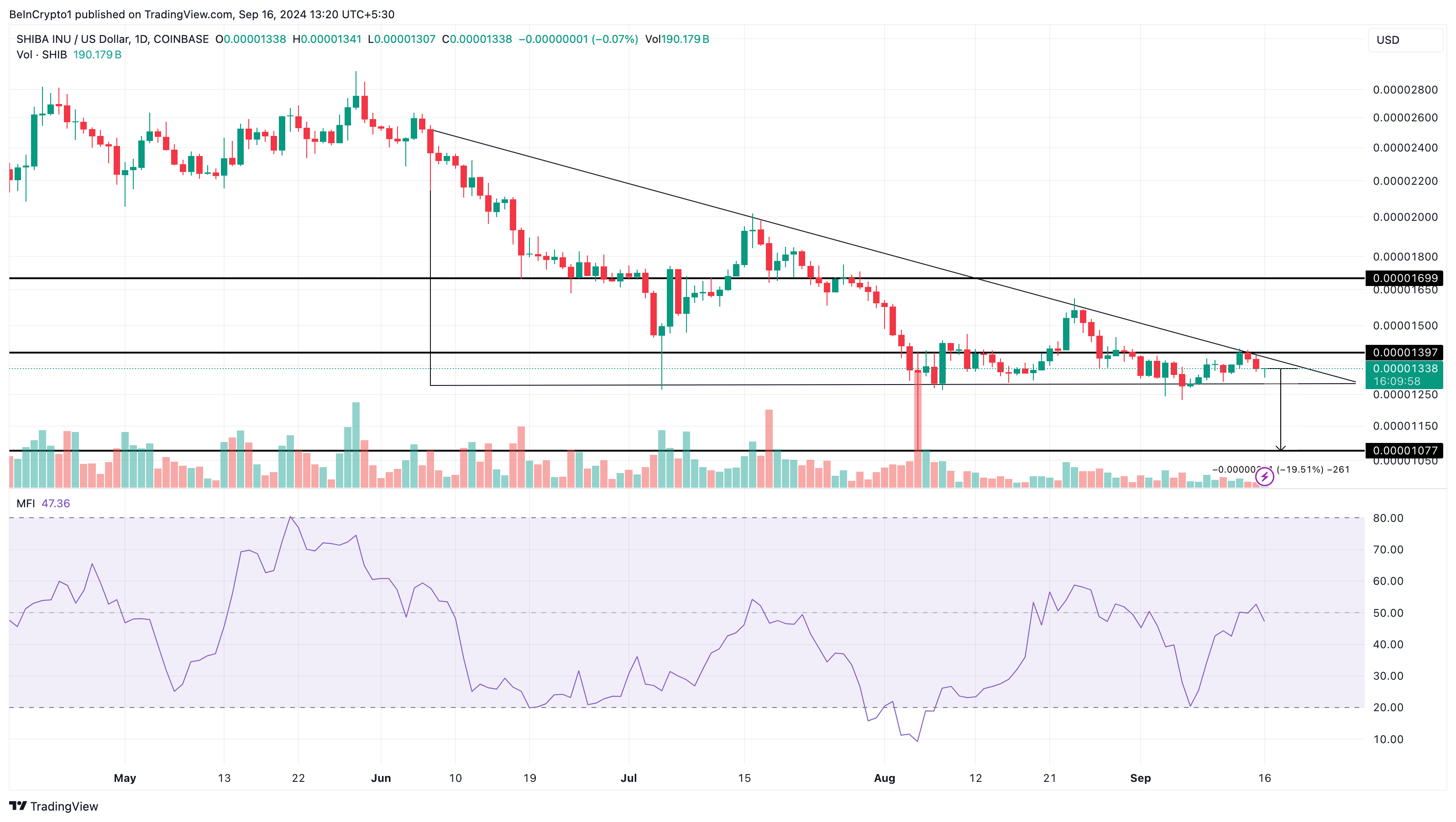 Like the IOMAP metric, the daily SHIB/USD chart also shows resistance at $0.000014. Additionally, SHIB has been trading within a descending triangle pattern since June.