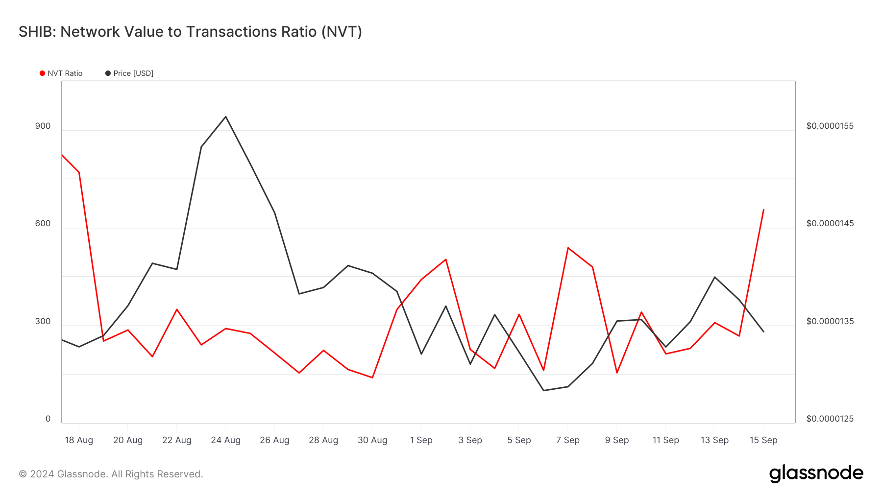 Shiba Inu (SHIB) is currently trading at $0.000013, still down 85% from its all-time high. According to Glassnode, SHIB’s Network Value to Transactions (NVT) ratio spiked on September 14 and remains elevated as of now.