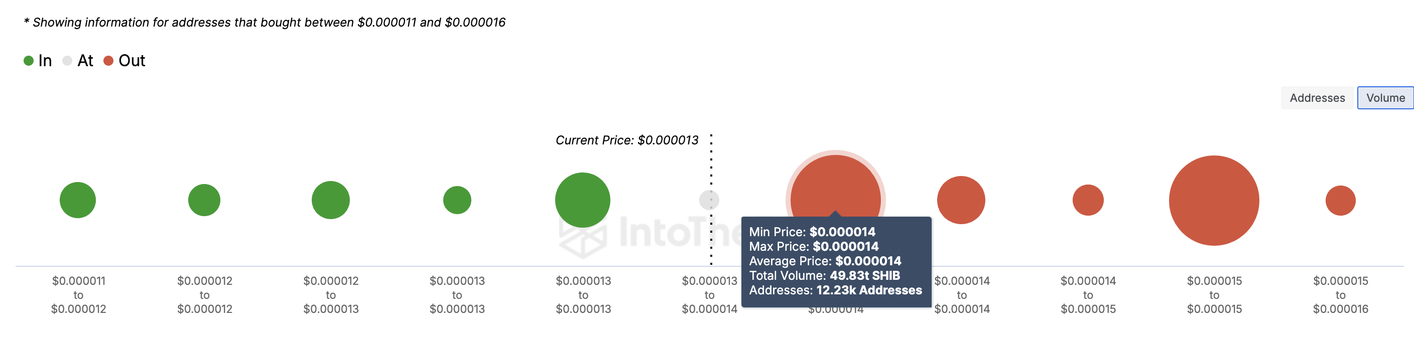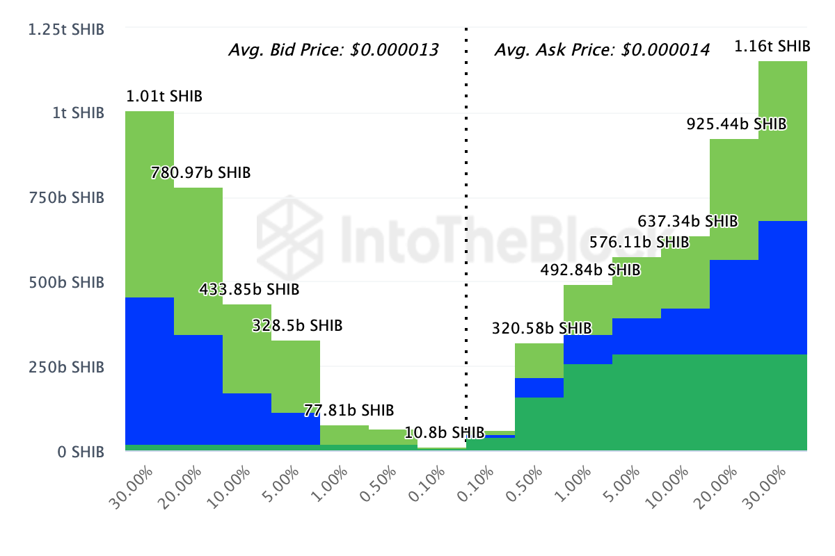 From an on-chain perspective, the In/Out of Money Around Price (IOMAP) shows that SHIB’s price could face resistance at $0.000014. For context, the IOMAP classified addresses based on those in profits, those out of gains, and those at breakeven point.
