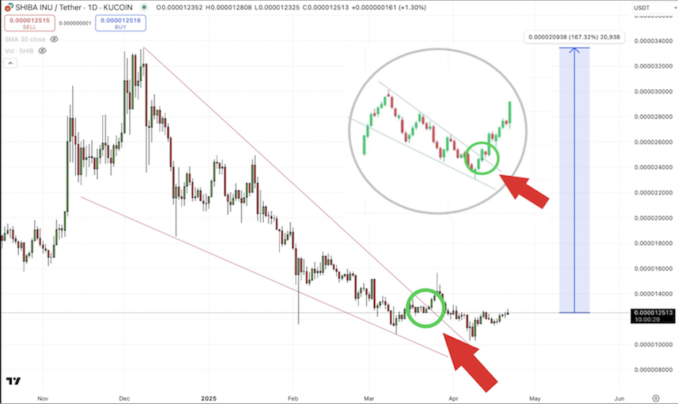 Analyst ALLINCRYPTO revealed via X on April 23 that Shiba Inu price “upside is expected,” given a falling wedge pattern is confirmed on the broader time frame chart. This pattern likely suggests that a massive price rally for the meme coin lies ahead; here’s why: