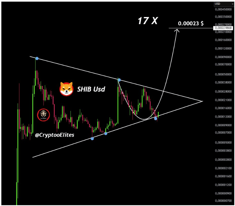 The technical setup outlined in the analysis suggests that if Shiba Inu can break above the triangle’s upper boundary, a 17X surge toward the $0.00023 price level could follow. Although the predicted move looks too bullish, it aligns with standard principles of technical analysis regarding breakout from symmetrical triangles.
