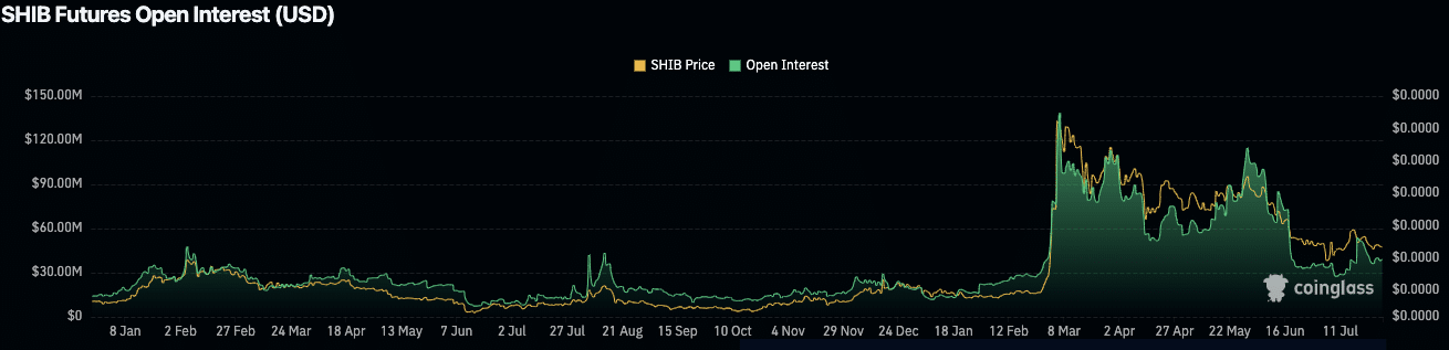 Meanwhile, the SHIB futures open interest currently stands at $41.58 million, reflecting a slight decrease of 0.40%. This suggests that while there is still considerable trading activity, it has tapered off from its peak levels seen in mid-July.
