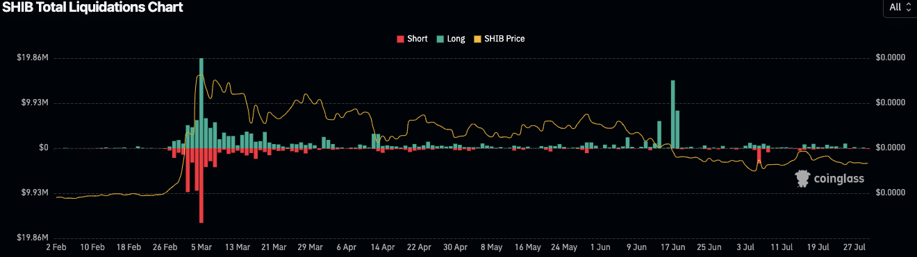 The increased burn rate, combined with the rising adoption rate, points to a growing confidence in the SHIB market. The SHIB liquidation chart from Coinglass indicates major liquidation events in early March and mid-June, with substantial long liquidations during these periods.