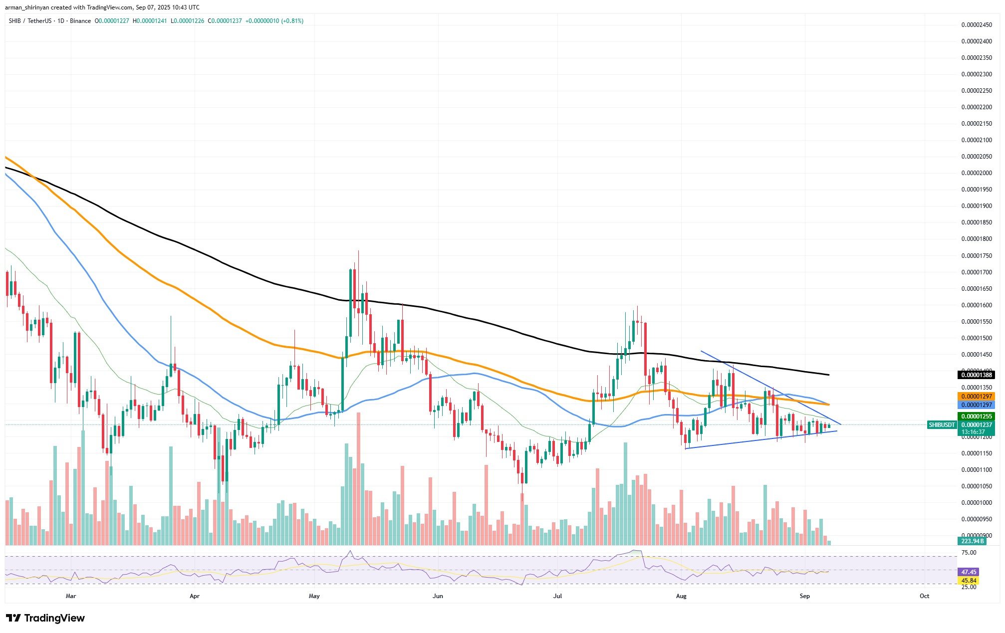 One of the biggest breakouts of SHIB in 2025 may be on the horizon as the asset coils tighter within a symmetrical triangle. Since the middle of August, the pattern has been developing with higher lows and lower highs combining to form a condensed range around $0.00001236. For SHIB traders, the next few days are crucial because these setups usually resolve with significant volatility.