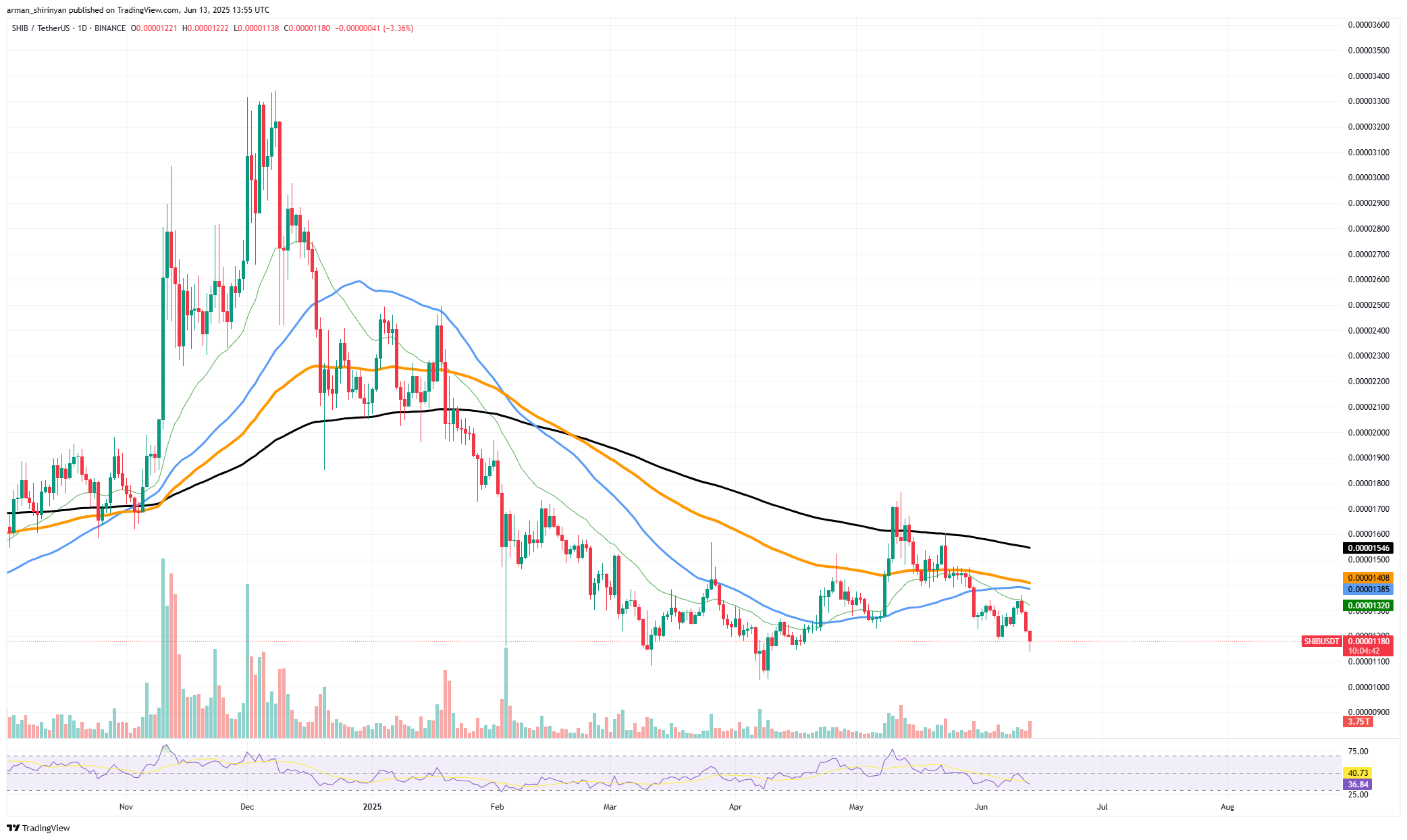 Following several unsuccessful attempts to break above resistance close to the 50-day and 100-day EMAs, which are both presently convergent around $0.0000138-$0.0000140, the market broke through this floor. The asset has sunk so far into bearish territory that the 200-day EMA, which is situated further above at $0.00001546, has remained unchanged for weeks. The volume of this breakdown spike is also concerning because there is not any obvious buying support to intervene, leaving SHIB open to further declines.
