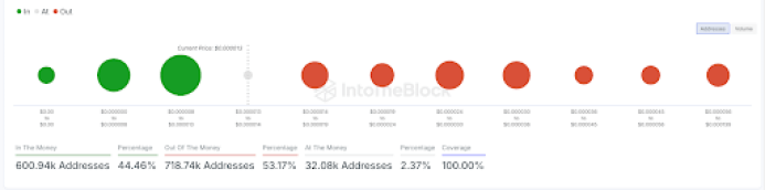 Data from the market intelligence platform IntoTheBlock shows that the ‘In The Money’ metric is bearish as 53.17% of SHIB addresses are now out of the money thanks to the meme coin’s recent price decline. This is significant as those currently holding at a loss could sell their tokens in a bid to cut their loss, leading to more price declines for Shiba Inu.