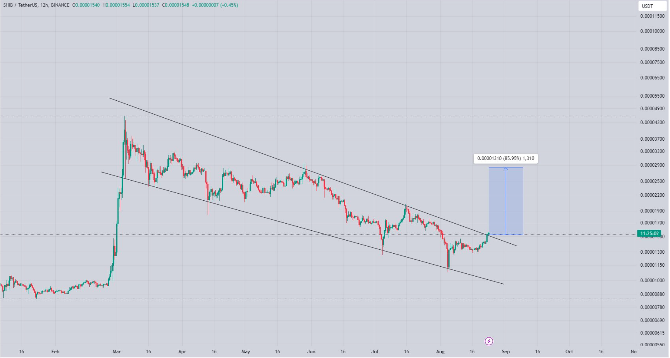 As per the tweet, a bullish falling wedge pattern appeared on SHIB’s chart. The bullish pattern first emerged in March and since then has been consolidating, only to break out on the 24th of August.