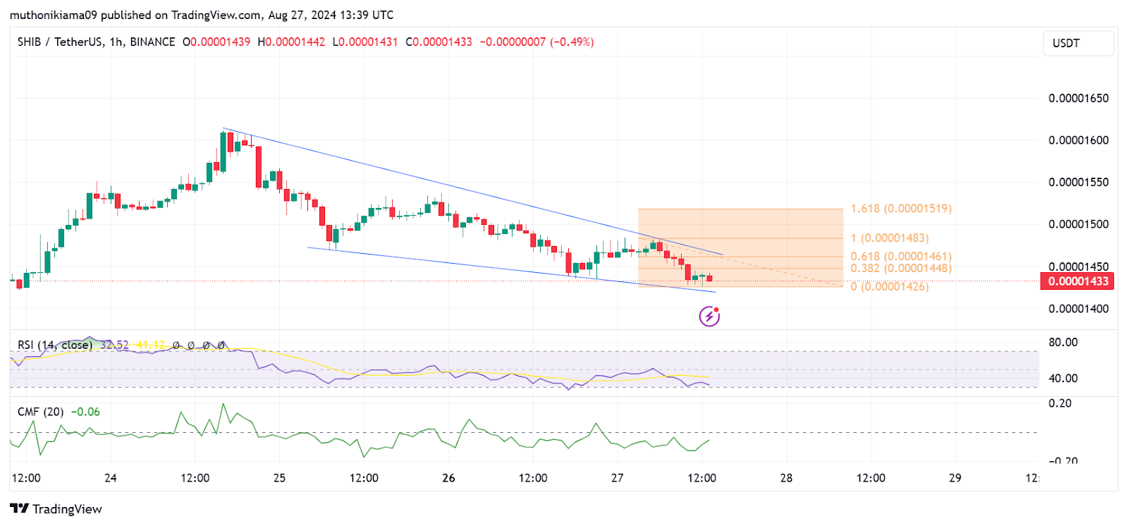 SHIB was trading at $0.00001442 at the time of writing. The price has formed a falling wedge pattern on the one-hour chart. If buyers step in, this bullish pattern could usher in gains for SHIB holders.