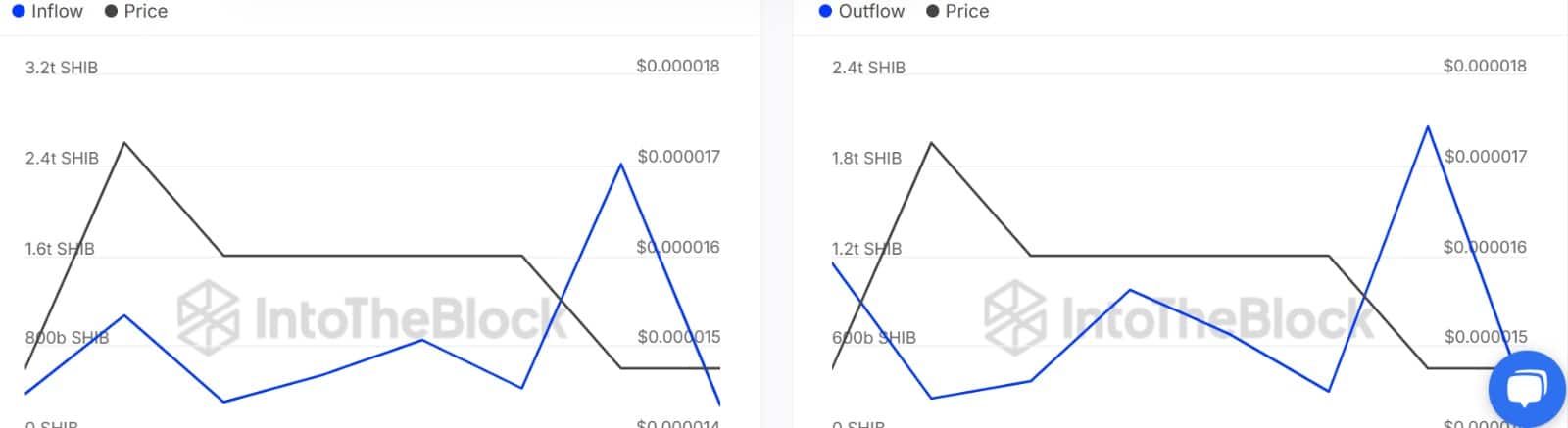 As per IntoTheBlock data, SHIB whale buying has significantly declined from 2.4 trillion to 271.9 billion. Both outflow and inflow have declined by over 2 trillion each, signaling a massive drop in whale activity.