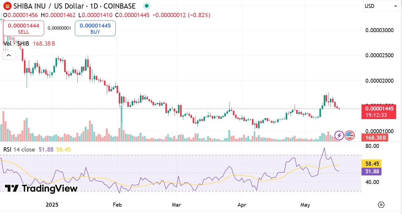 As of writing, SHIB traded at $0.00001429, down 5.65% in 24 hours. SHIB has closed with lower lows, dipping on its price charts for six consecutive days.